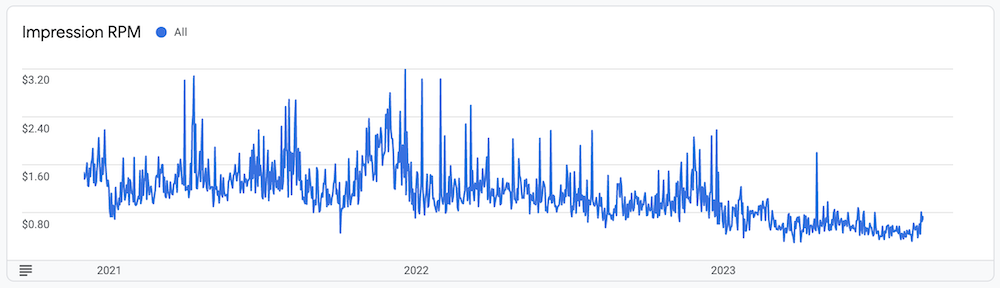 I know that I've spent some time this year complaining about ad revenue, and even outlined what it costs to run my sites, but after a brief semi-reprieve early this summer, it's gone back to pretty terrible. You can tell the story in one chart from the last three years: